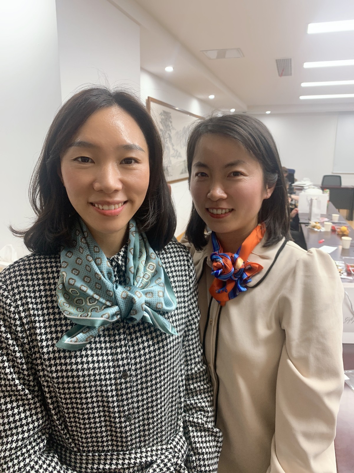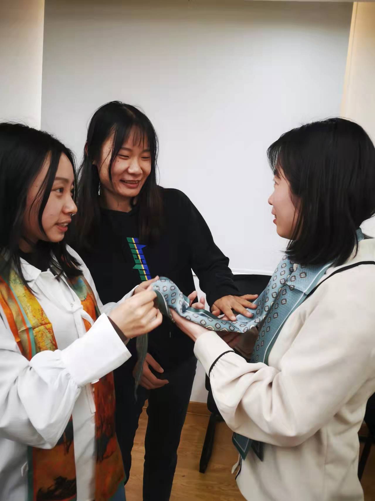 大家快樂(lè)地打開“絲巾”盲盒后,一起學(xué)習(xí)了多種系絲巾方法。大家享受著搭配色彩、設(shè)計(jì)造型、相互系絲巾帶來(lái)的樂(lè)趣和美好體驗(yàn),展示著各自的才藝。